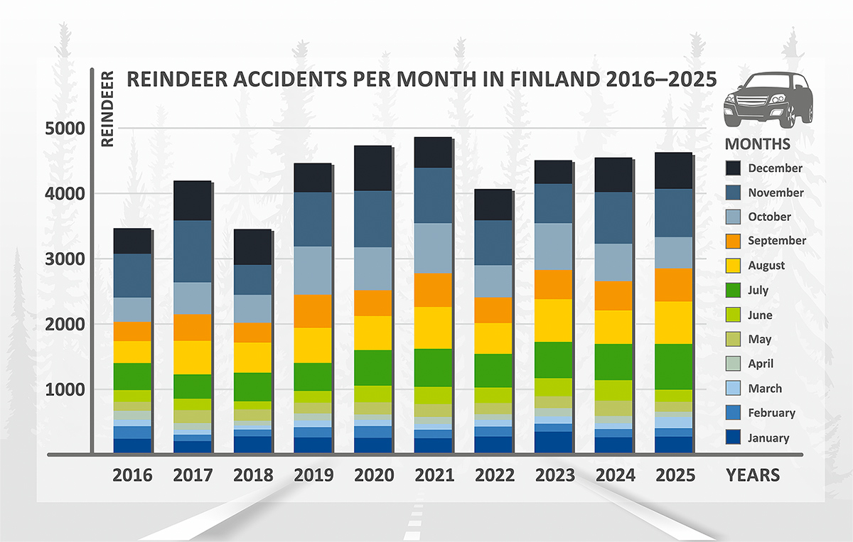 Reindeer accidents per month in Finland 2016-2025.