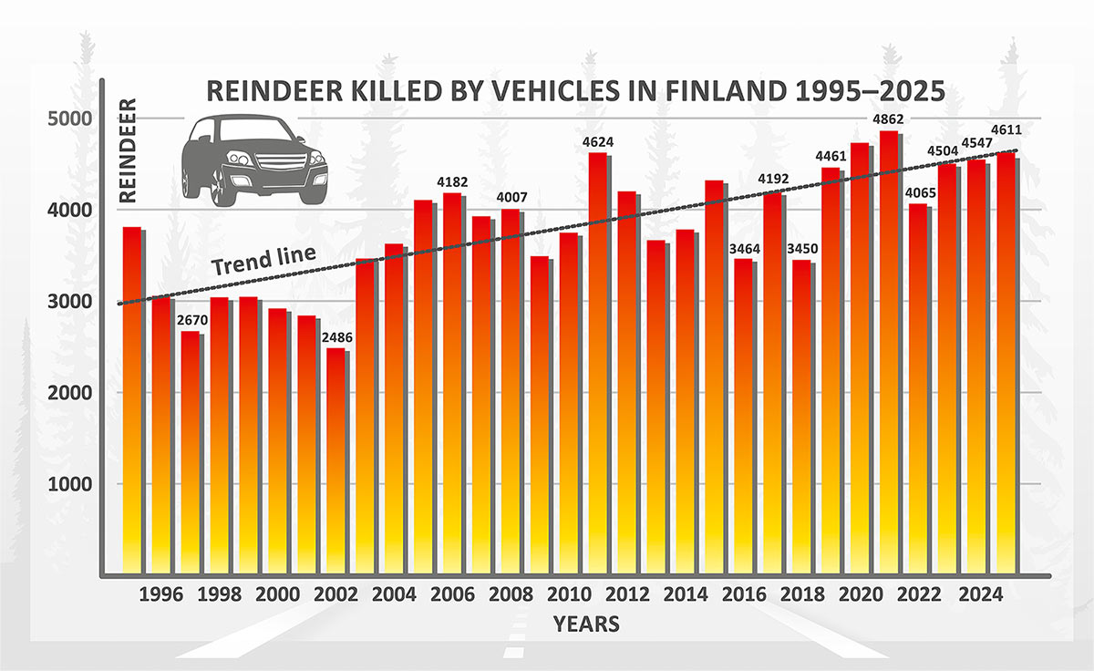 Reindeer killed by vehicles in Finland 1995-2025.
