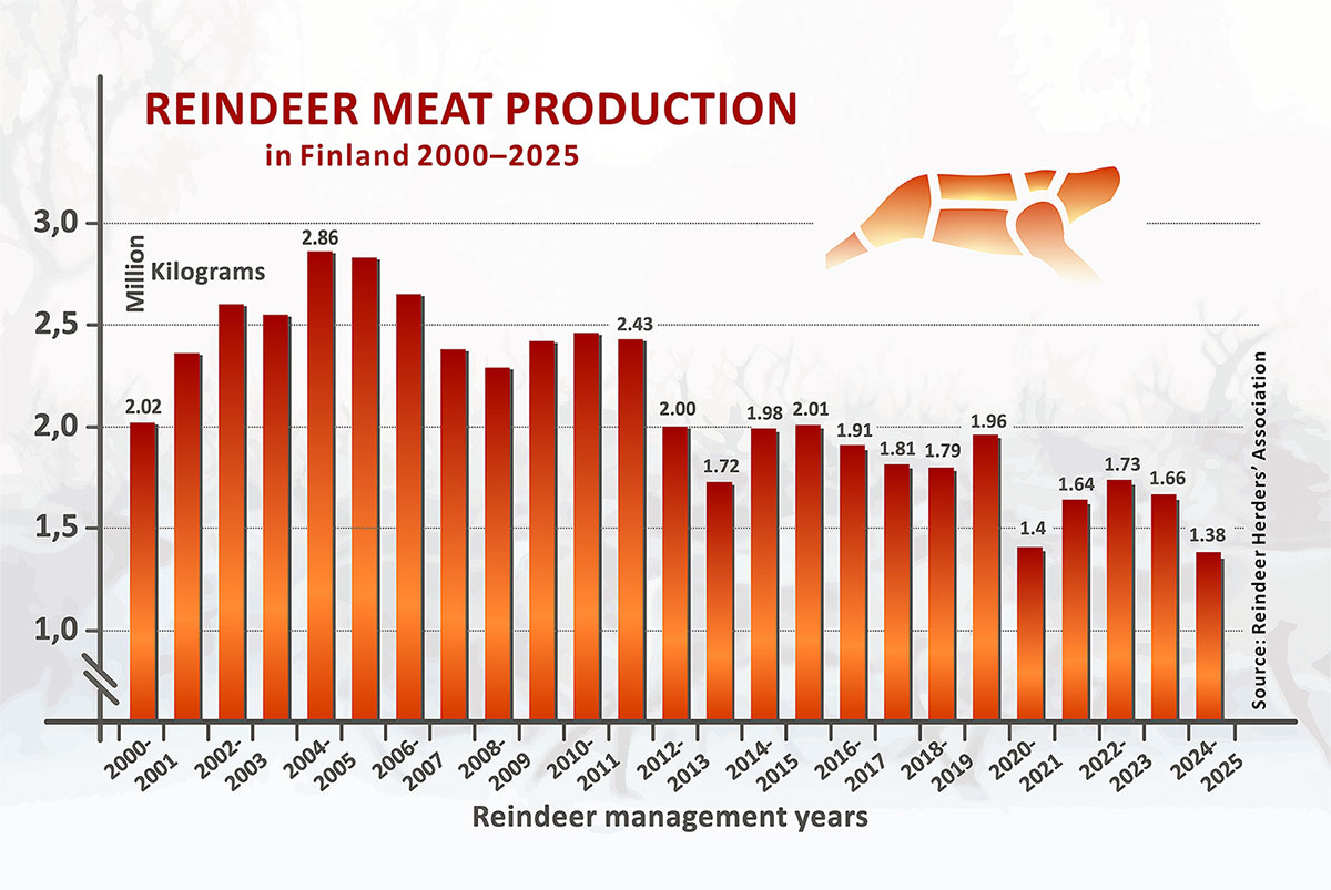 The production of reindeer meat varies annually. Primarily these variations are due to the conditions in the nature and the effects of large carnivore. The declining amount of reindeer meat is afflicting reindeer herders and meat producers (click image for larger view).